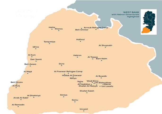 تقع محافظة الخليل في أقصى جنوب الضفة الغربية، على بُعد نحو 36 كيلومترًا جنوب مدينة القدس، ويحدّها من الشمال محافظة بيت لحم، ومن الجنوب والشرق والغرب الخط الأخضر (خط الهدنة لعام 1949). تمتد المحافظة على مساحة تُقدّر بـ937 كم²، تشمل مناطق سكنية فلسطينية، ومستعمرات إسرائيلية، وقواعد عسكرية، وأراضٍ مغلقة تسيطر عليها قوات الاحتلال، إلى جانب محميات طبيعية، غابات، وأراضٍ زراعية خصبة. ويبلغ عدد سكان المحافظة نحو 853,383 نسمة، مما يجعلها أكبر محافظة في الضفة الغربية من حيث عدد السكان.