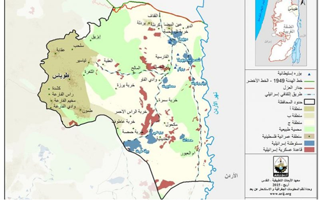 تعتبر محافظة طوباس والاغوار الشمالية منطقة استراتيجية هامة ، التي تمتاز بجودة أراضيها، وصلاحيتها لزراعة الكثير من المحاصيل . وتقسم محافظة طوباس (وفق "اتفاقية أوسلو") إلى مناطق "أ"، وتشكل 11% من المساحة الإجمالية، وتشمل 8 تجمعات سكانية ثابتة، وهي: "طوباس، وعقابا، وتياسير، وقشدة، ورأس الفارعة، ومخيم الفارعة، وطمون، ووادي الفارعه"؛ ومناطق "ب" وتشكل 5 % من مساحة المحافظة، وتشمل تجمعين سكانيين ثابتين، هما: " عاطوف والثغرة " ؛ ومناطق "ج"، وتشكل 84% من مساحة المحافظة.